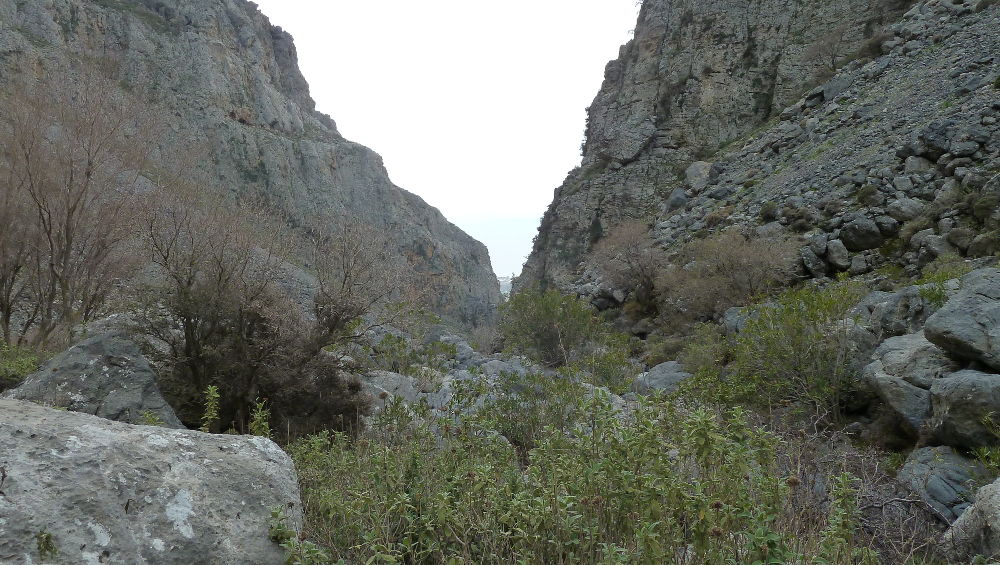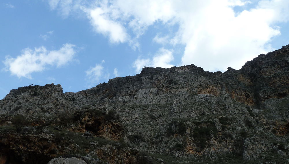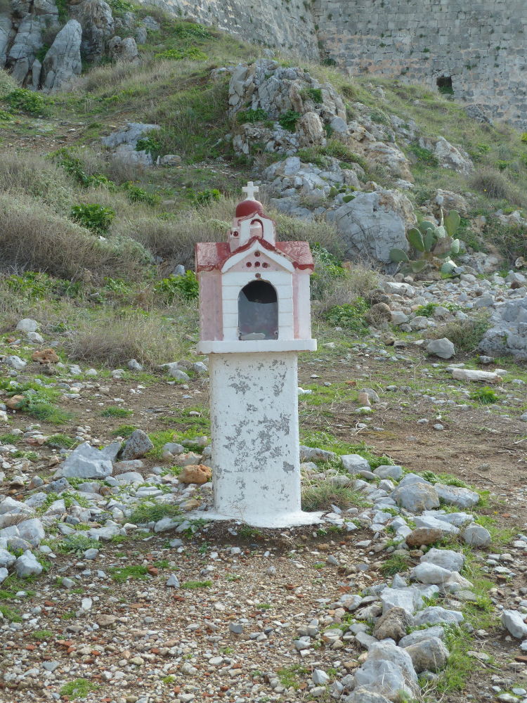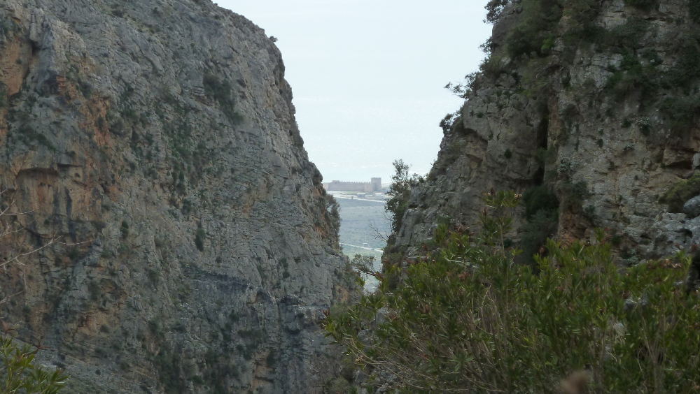 Da ich in Frangokastello recht spontam bleiben wollte und keine Unterkunft vorgebucht hatte, war die erste Herausforderung, ein Bett für die Nacht zu finden. Mit Rat von einem Kunden in dem kleinen Ortsladen konnte sich dies lösen und es gab sogar ein Grillrestaurant, das zu dieser Jahreszeit offen hatte. Nach einem selbstzubereiteten Frühstück ging es am nächsten Morgen zuerst los zu einer durchaus anspruchsvollen Wanderung durch die Kallikratis-Schlucht hoch bis zum Punkt wo man das Kastell zum letzte Mal erblicken kann, hier gibt es die genauen Koordinaten: Geocache GC1RV8P
