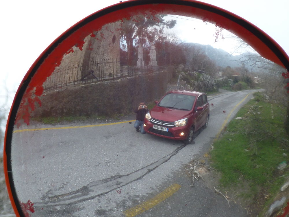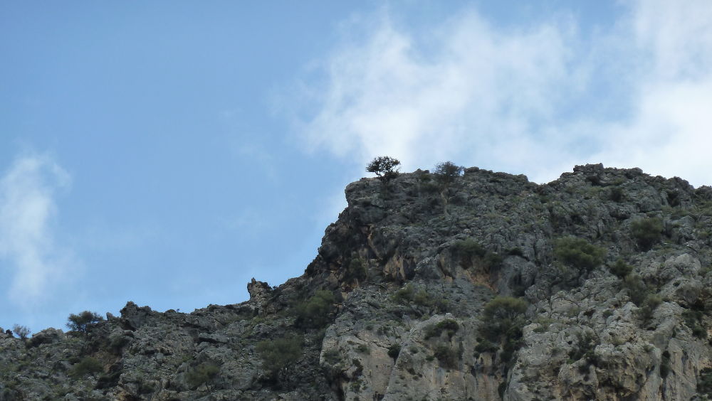 Oben, Bergpanorama von der Regionalstrasse 97; in der Kallikratis Schlucht: das Kastell der Franken kommt näher und näher; unten, einsamer Baum an einem Bergvorsprung oberhalb der Schlucht.