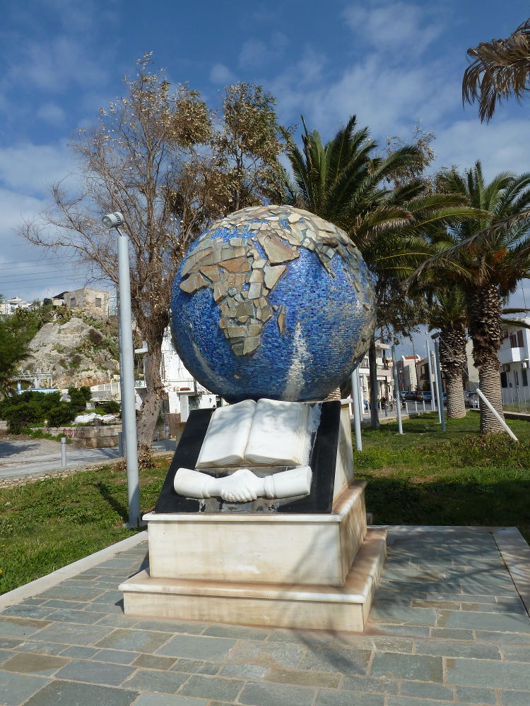 Oben, die Weltkugel in Rethymnon und im Zentrum: natürlich Kreta! Unten, ein Schrein zur Erinnerung an verunglückte liebe Nahestehende - unterhalb der Festung auf der zum Meer zugewandten Seite, und Aussicht über die Stadt - von der Festung aus gesehen.