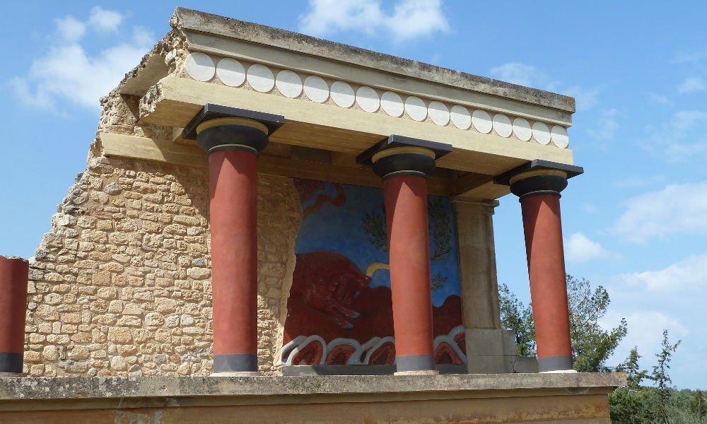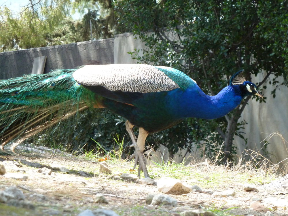Oben und unten: Knossos, neben den Palästen von Malia, Phaistos und Kato Zakros der größte minoische Palast auf Kreta. Waren die minoischen Paläste Kretas keine geistig-kulturellen oder politischen Zentren gewesen, sondern Nekropolen zur Bestattung der Toten? - entsprechend der Interpretation von Hans Georg Wunderlich. Ein Pfau (auch als Symbol der Unsterblichkeit der Seele) scheint sich heute dort jedenfalls wohl zu fühlen.