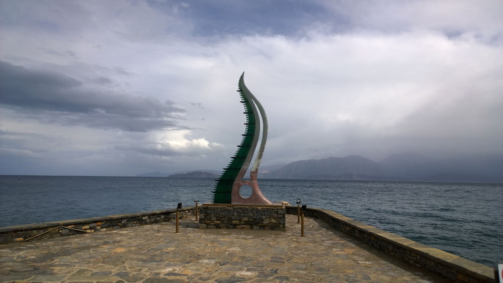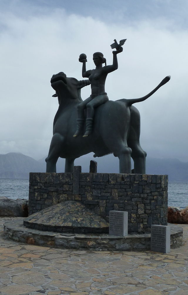 Von oben: Blick auf Neapoli, dem ehemaligen Zentrum des Lasithi Distrikts - und immer noch quirlige Kleinstadt; die kleine Fischerkirche und Monument zu Ehren von Zeus (als Stier) und Europa, den Gründern der minoischen Kultur. Unten: das Horn von Amalthea (mit Detail) sowie Eindrücke entlang der südlichen Küste von Agios Nikolaos.