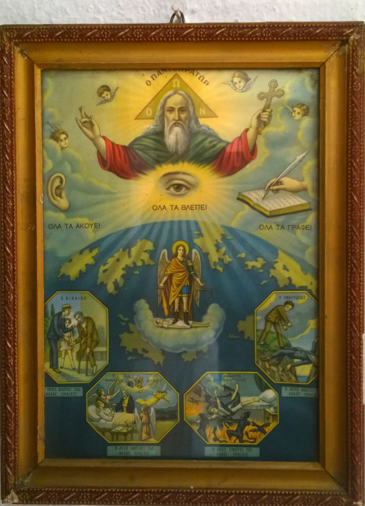 Von oben, Aussicht von Gournia auf das Meer; die Kapelle der Heiligen Pelagia mit Ikone; Steinbrücke in der Richtis Schlucht - von Orangen und Zitronenhainen umgeben.