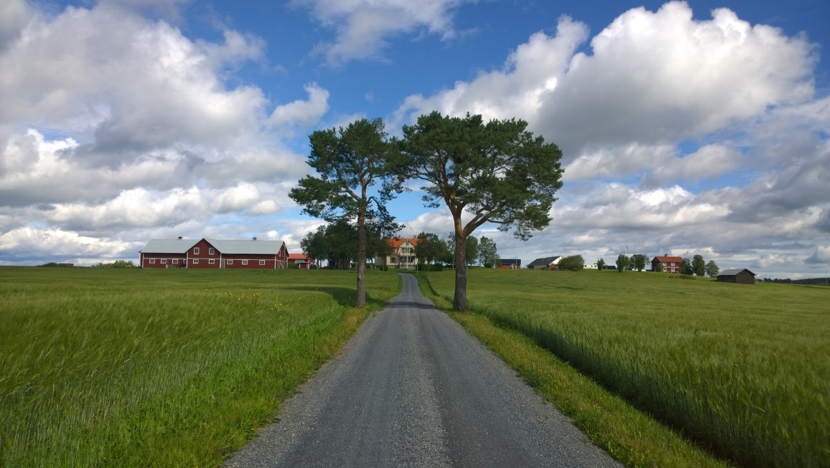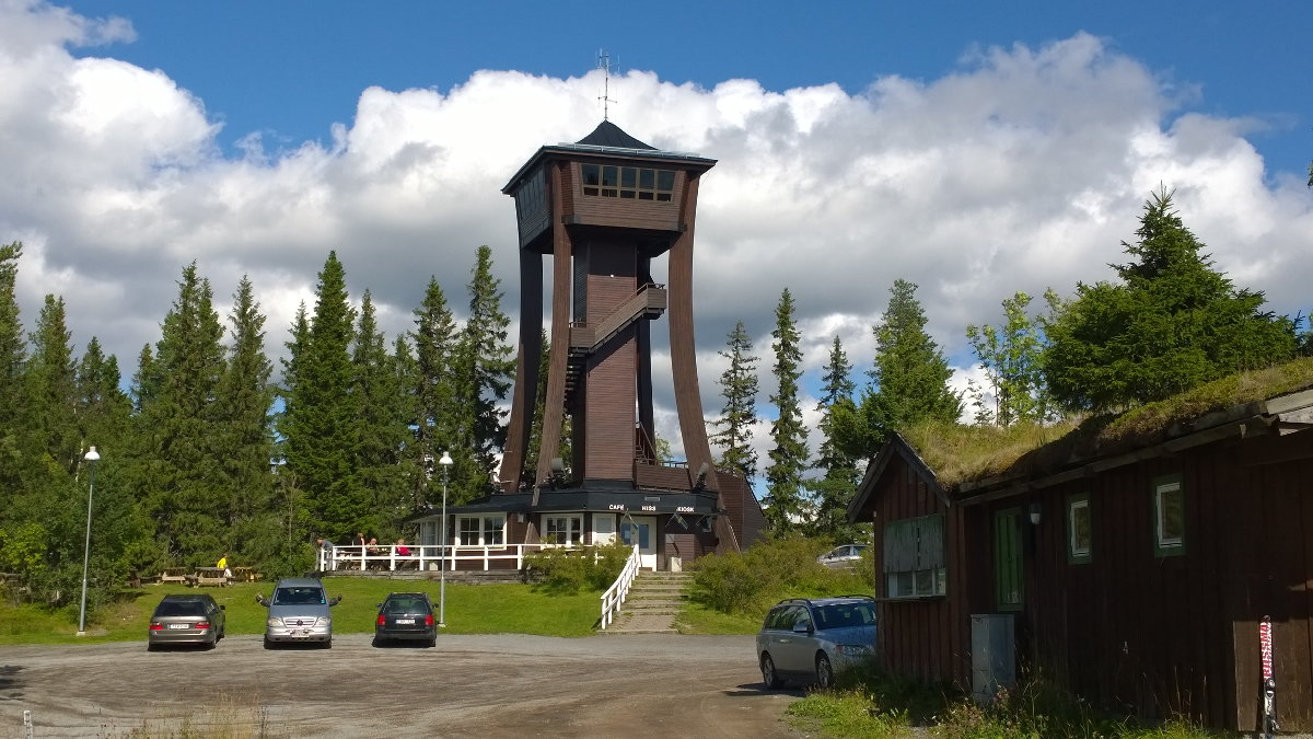 Von oben, Frösö Kirche (ursprünglich aus dem 13. Jahrhundert, errichtet auf einer alten Wikingersiedlung, umgebaut im 18. Jahrhundert, nach einem Brand Ende des 19. Jahrhunderts wieder aufgebaut), Wanderung entlang des St. Olav Pilgerweges und ein Hof, unten: Aussichtsturm auf dem Östberge (ca. 465 Höhenmeter) und die prächtige Aussicht vom Turm. Danach natürlich Fika im Turmgcafe!