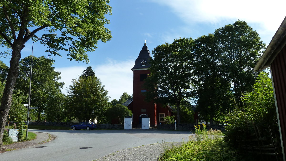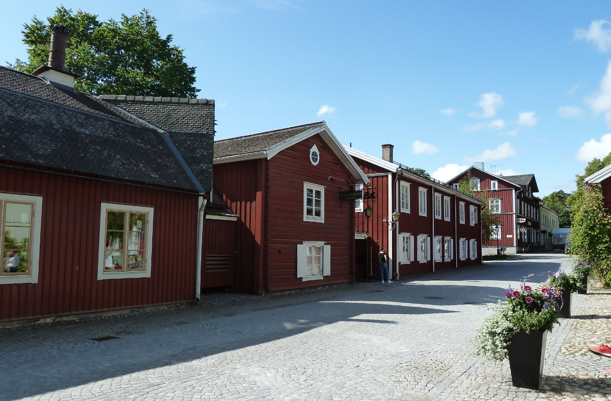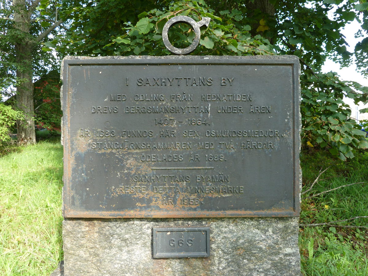 Oben, Gedenkstein an die Zeit, als Erz in Saxhyttan verhüttet wurde - seit vorchristlichen Zeiten bis ins Jahr 1864; Grythyttan Kirche und Hauptstrasse - viele Holzhäuser im traditionellen Falun-Rot.