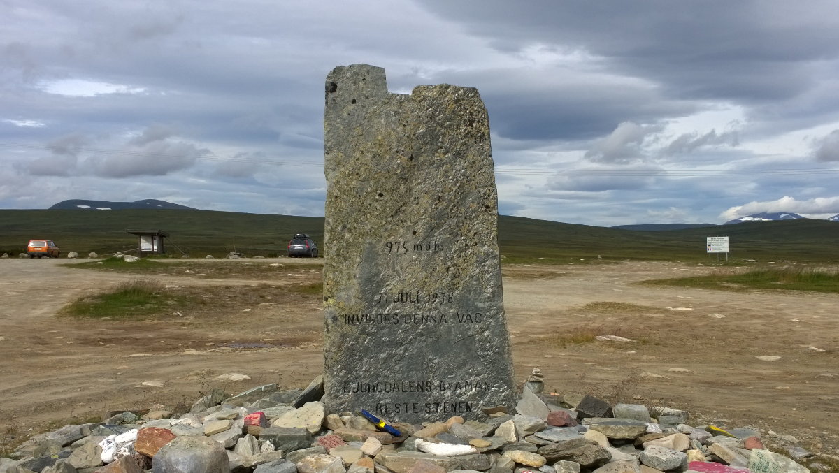 Oben, Landschaft mit Rentieren und Gedenkstein zur Erinnerung an den Bau des Flatruetweges 1938; Entlang der Landstrasse 311: Holzsensenmann in Rändingsvallen, sowie Gedenkdankstein an die Dorfgründung von Högvålen 1760 und Naturlandschaft nördlich von Sörvattnet.