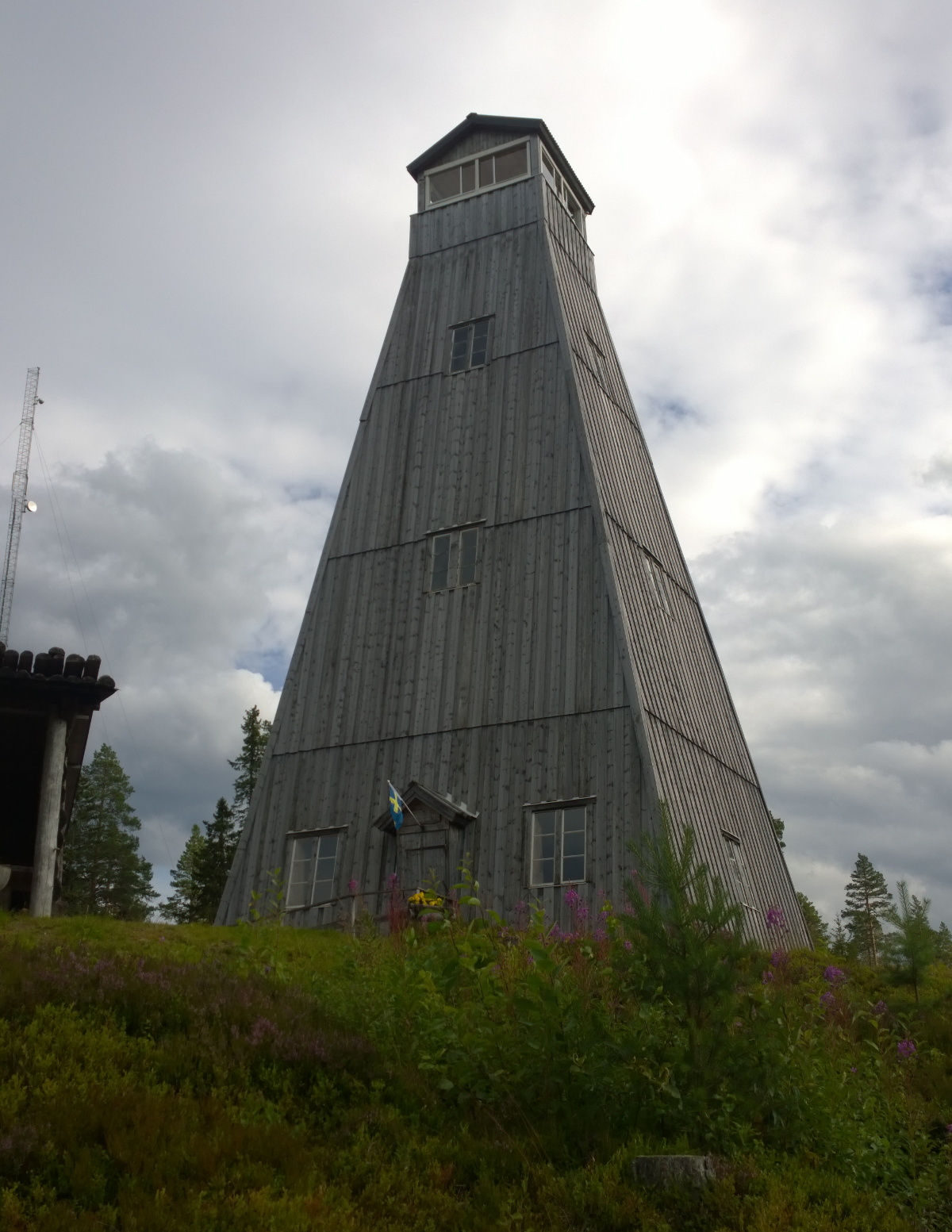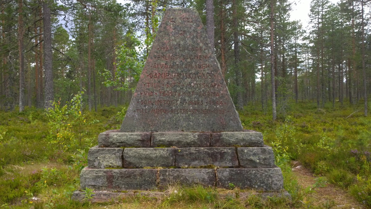 Unten, entlang des Reichsweges 70, Lomkällan, Waldmuseum, Bunkris Waldbrandwachtturm und Aussicht in die Weite; Gedenkstein an Daniel Buskovius, dem Nationalhelden, der 1644 die lokale Armee in einen erfolreichen, aber unblutigen "christlichen" Eroberungsfeldzug gegen die nahe Särna Gemeinde anführte, weitere Details unter Geocache GC36T64 Buskowius stenen.