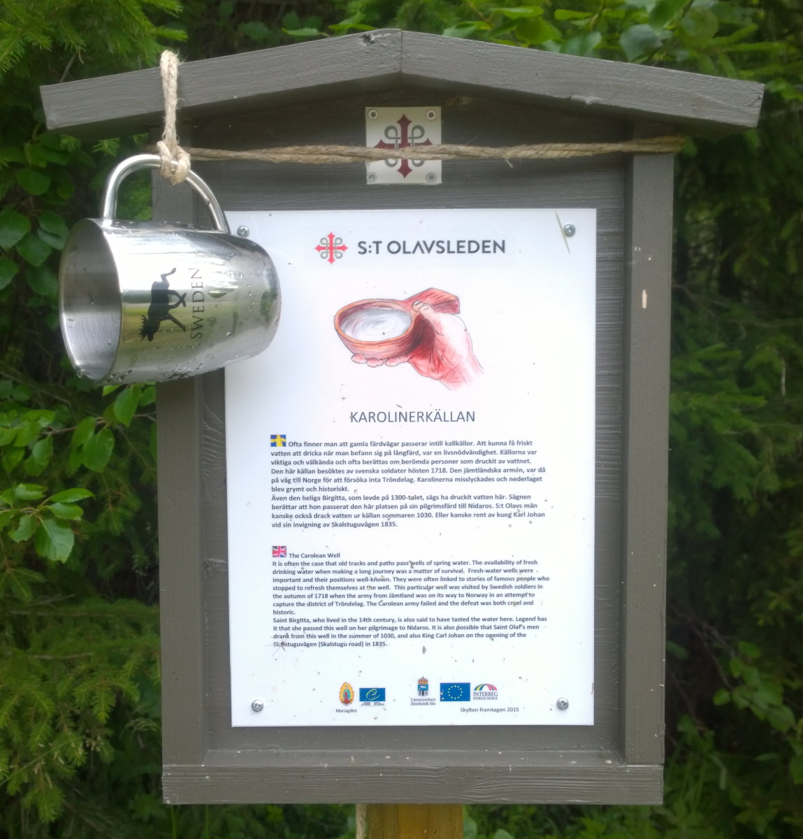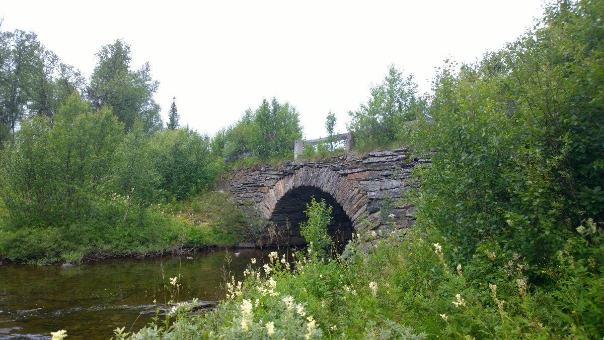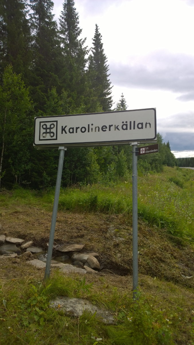 Oben, entlang des Karl-Johans-Weges - falls es einem durstig wird unterwegs, gibt es einen Trinkbecher an der Karoliner-Quelle. Auch hat es zahlreiche gut erhaltene alte Steinbrücken, wie hier über den Saxån. Unten, Brücke über den Innan (GPS Koordinaten N 63° 42' 1.37'' O 11° 53' 29.16'') sowie die Munkeby Herberge. Man fühlt den Regen in den Bildern!