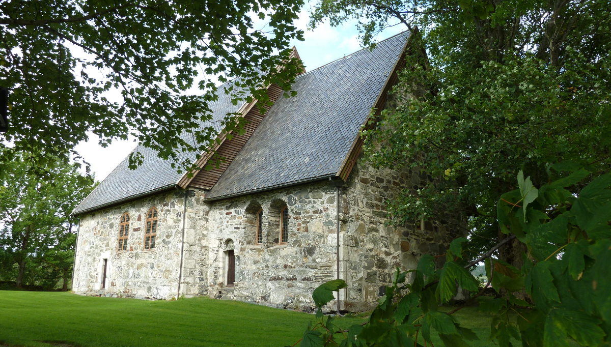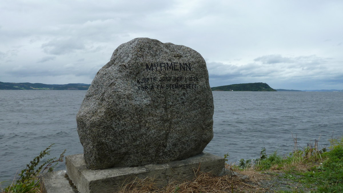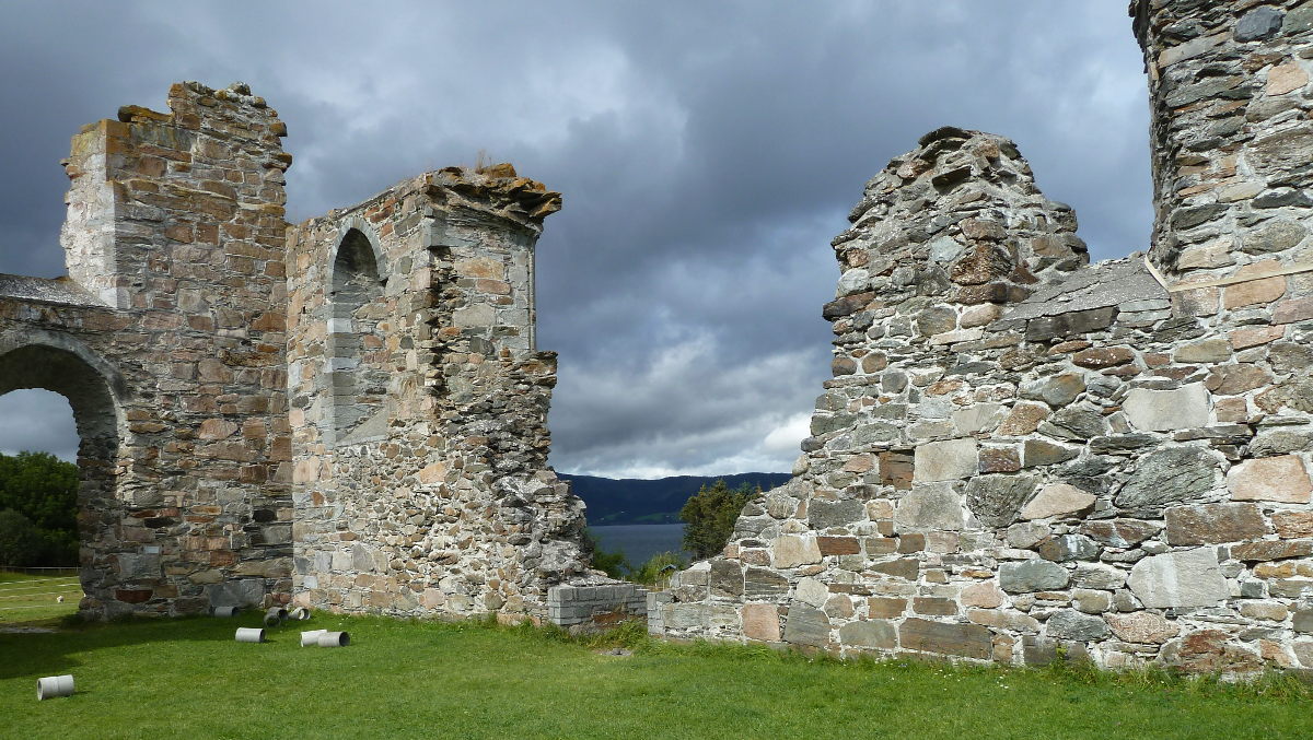 Oben, Logtun Kirche, Innen- und Aussenansicht und Blick von der Tautra Klosterruine auf den Trondheim Fjord; Unten, Mariakloster Aussen- und Altar-Innenansicht. Sowie ein Gedenkstein an den 13. Juni 1879, als 27 Bürger einen symbolischen Quadatmeter (eher nutzlosen) Grundes kauften, um dadurch Stimmrecht zum Norwegischen Parlament zu erhalten, für Details siehe GCQ35W Geocache Myrmennene på Framnes.